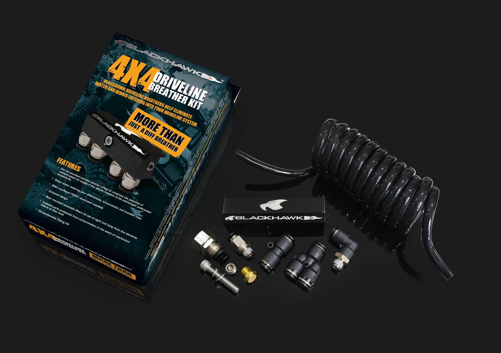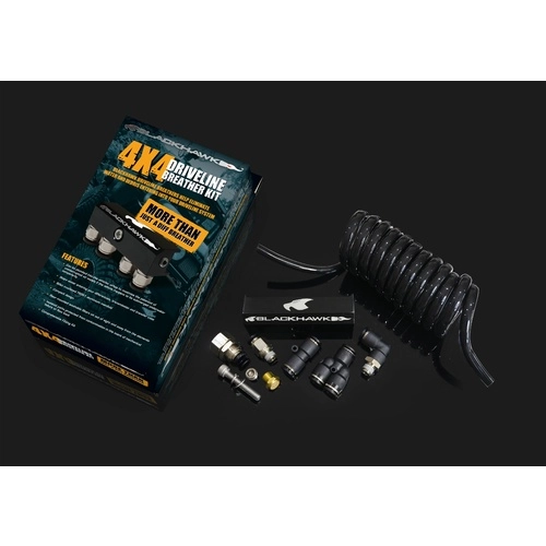 When the vehicle is running at normal operating temperatures and driveline components come into contact with water or mud, the change in temperature creates a vacuum inside your hot diffs, gear box or transfer case. This pressure shift encourages mud, water and debris to be ‘sucked’ in to the driveline components through the factory breathers or seals. The Blackhawk Driveline breather kits replace the factory breathers and allow for the driveline components to be vented in one central location, generally high above the potential water/mud level, allowing the components to breath freely, eliminating the potential for oil contamination that can lead to damaged drivetrain components.
