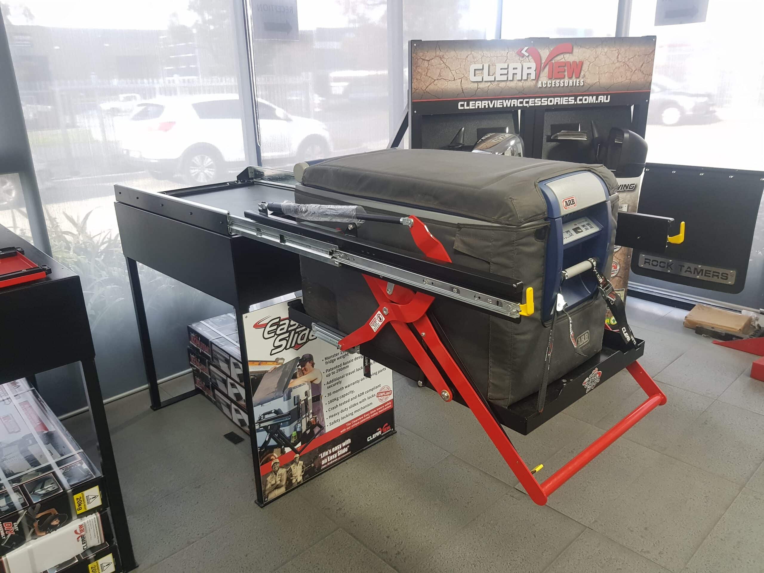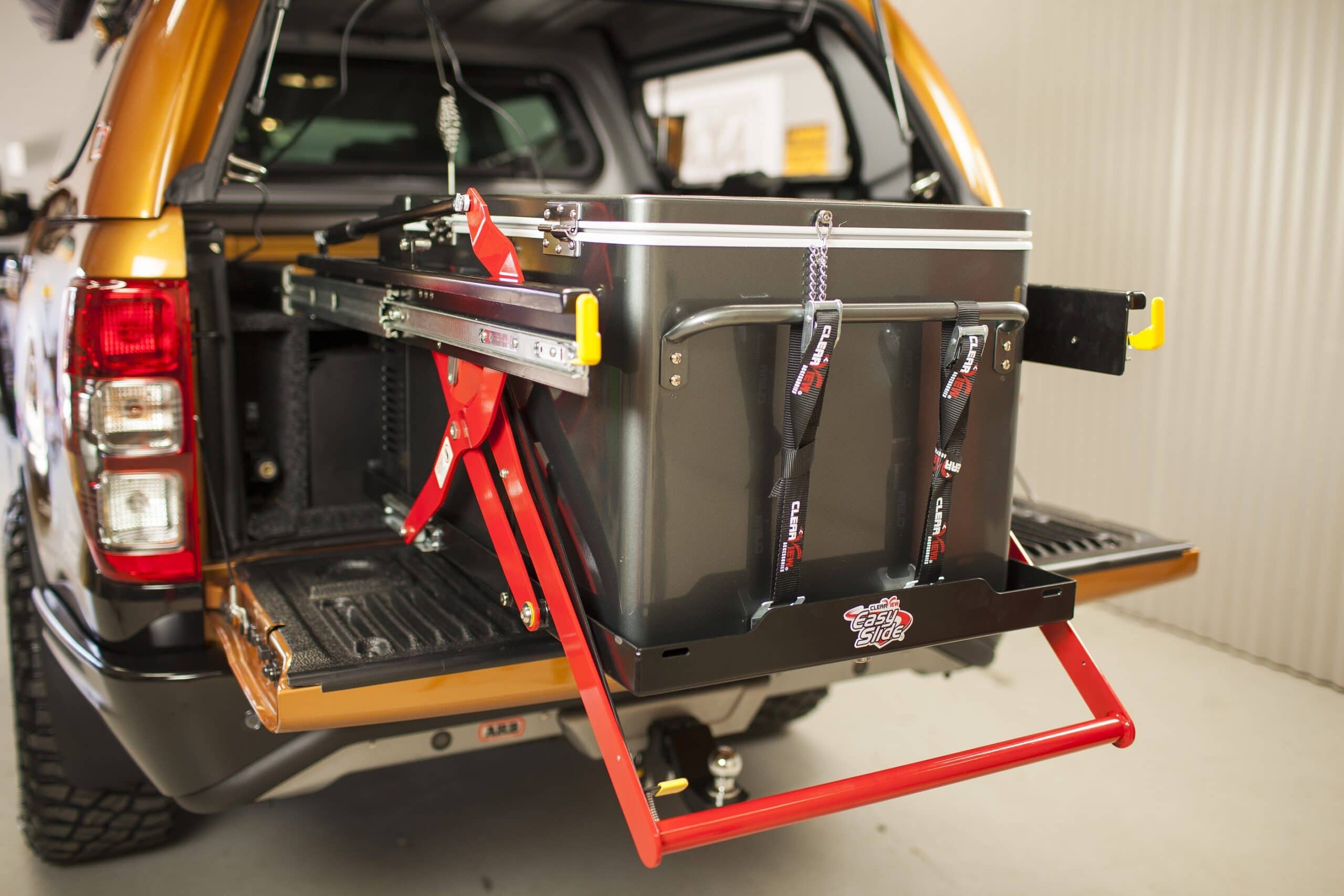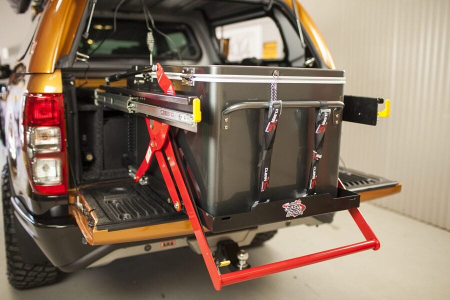 Simply unlock the travel lock mechanism, pull down on the yellow ergonomic slide quick release runner levers and pull the fridge towards you to full extension. A gas strut-assisted vertical scissor lift action and safety latch system then allows for safe and easy lowering of your fridge, providing convenient access to its contents.