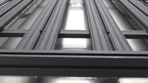 The Explorer Roof-rack is 1400mm long and 1200mm wide and is supplied with four flat fitment plates. The rack is made from aluminium alloy and is fully welded giving it massive strength and rigidity. The slats on the rack are 90mm wide and run length ways down the rack, each slat has and extrusion running down the middle that can take an M8 bolt head for attaching accessories.