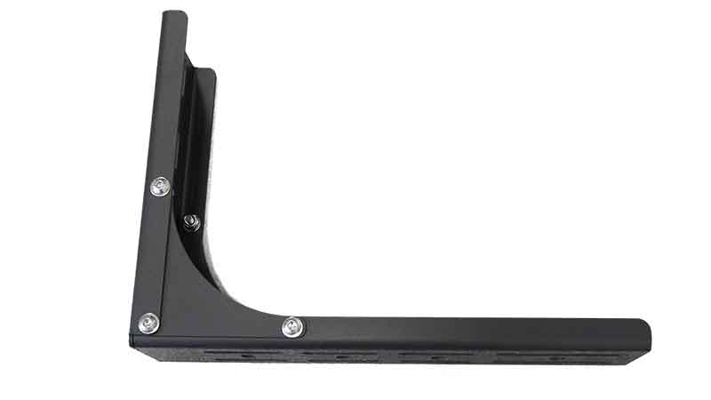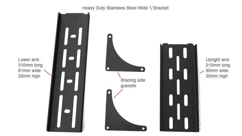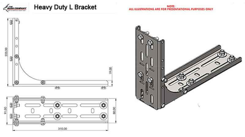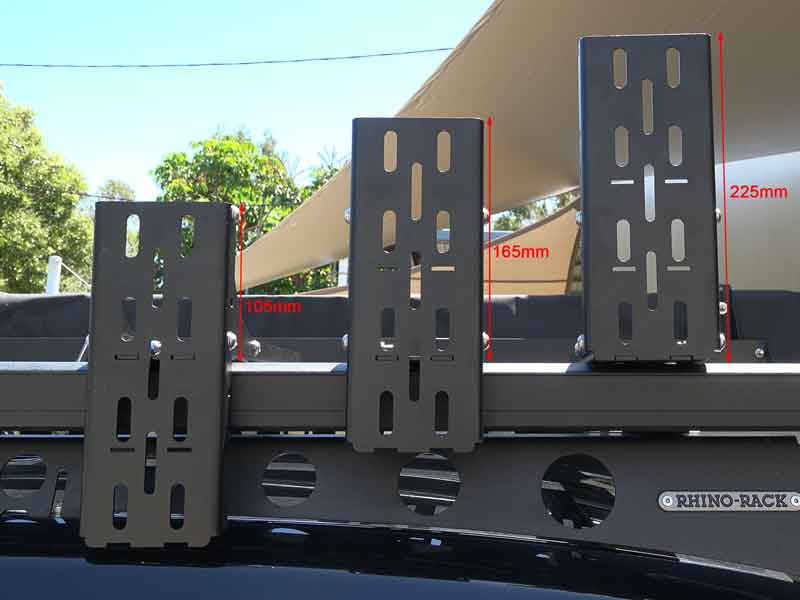 For any awning it is important that the bracket can support the weight of the awning in off-road conditions and when in use, especially the larger 270 degree awnings. The Heavy Duty L Bracket Long has been designed to suit The Bush Company awnings when fitted to load bars or a roof rack. The bottom arm which attaches to the load bar or roof-rack is 310mm (12 ¹³/₆₄”) long and 81mm (3 ³/₁₆”) wide with a range of holes and slot options for attachment, this longer arm is ideal for fitment to roof racks with wider slats where the attachment points are further apart such as a Rhino Pioneer Platform Rack. The vertical arm of the brackets can be configured in three positions enabling the height above the rack to be adjusted from either 225mm (8 ⁵⁵/₆₄”), 165mm (6 ¹/₂”) or 105mm (4 ⁹/₆₄”).