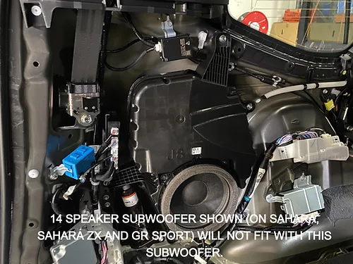 • DOES NOT FIT WITH 14 SPEAKER ENTERTAINMENT MODELS SAHARA, SAHARA ZX AND GR SPORT MODEL) as subwoofer is larger.