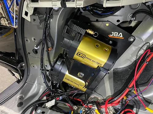 The JBA Y62 Patrol double compressor bracket enables a concealed fit for the TJM heavy duty single compressor behind the passenger side rear quarter panel.