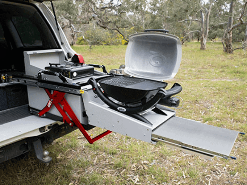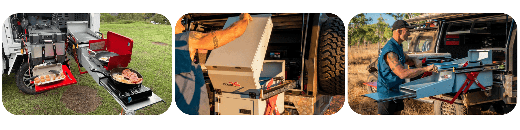 The Clearview® Pantry slide out kitchen features a clever, compact, fold-out design with modular components to maximise space inside your 4WD, canopy or camper trailer.