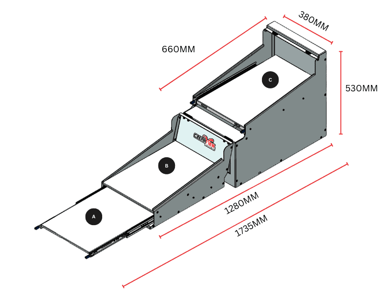 - Sliding platform and workstation platform mounted on 450mm slide rails with lock in/lock out function