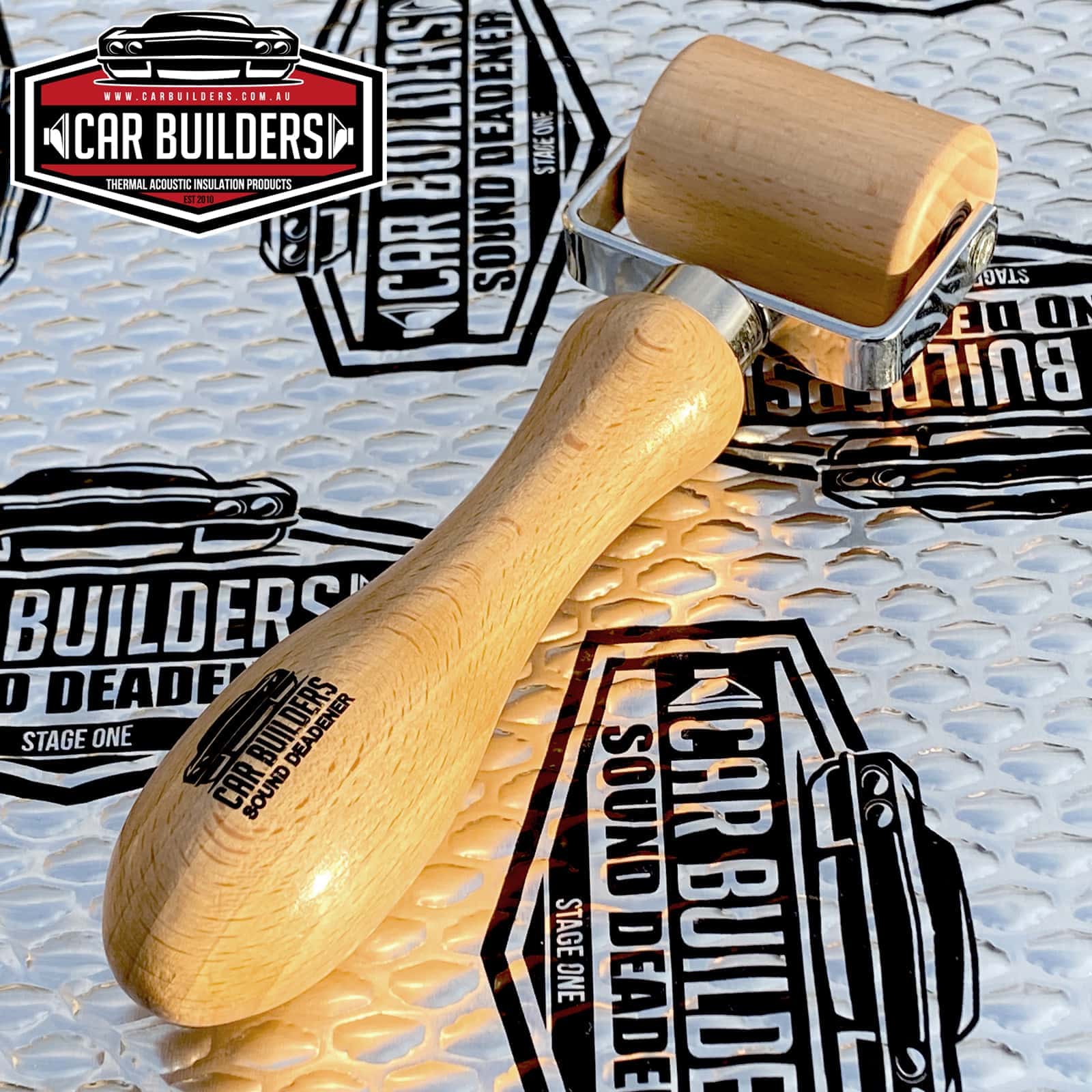 1 x Application roller – 50mm wide timber wheel with rounded edges, rolling on sealed bearings. Comfortable timber handle which doubles as a tapered end to work sound deadener sheets into corrugations on your floor pan.