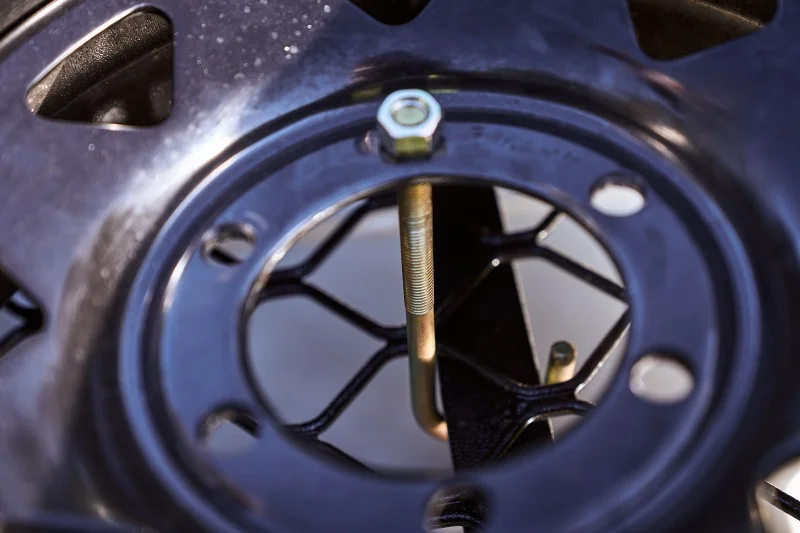 Handy entry level option for securing your spare- Fully and easily removable, Hooks around the rack cross members and tightens down through bolt holes in your rim, holding it secure. Two are recommended per tyre for best balance.