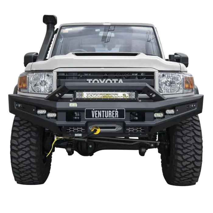 This genuine TJM Bar has been created to complement the design of your vehicle. The TJM Venturer bar delivers all-star looks and real-world protection where it counts. The Venturer features a boldly angular design with tapered wings that enhances the front of this Aussie icon product while also offering supreme impact protection. The TJM Venturer bar is put through a comprehensive design and testing process to ensure that it is airbag compatible and ADR compliant. Better yet, the TJM Venturer bar is embedded with TJM bull bar DNA, meaning it features an all-steel construction, winch facilities and rated recovery points as standard and an eye-catching design that enhances the aesthetics and functionality of your vehicle.